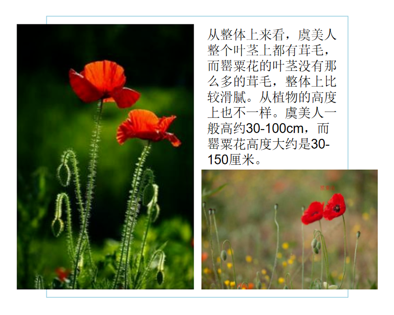 虞美人与罂粟花都属于罂粟科罂粟属的近缘植物,外形较为相似。而虞美人是常见的观赏植物,罂粟花是毒品原植物。