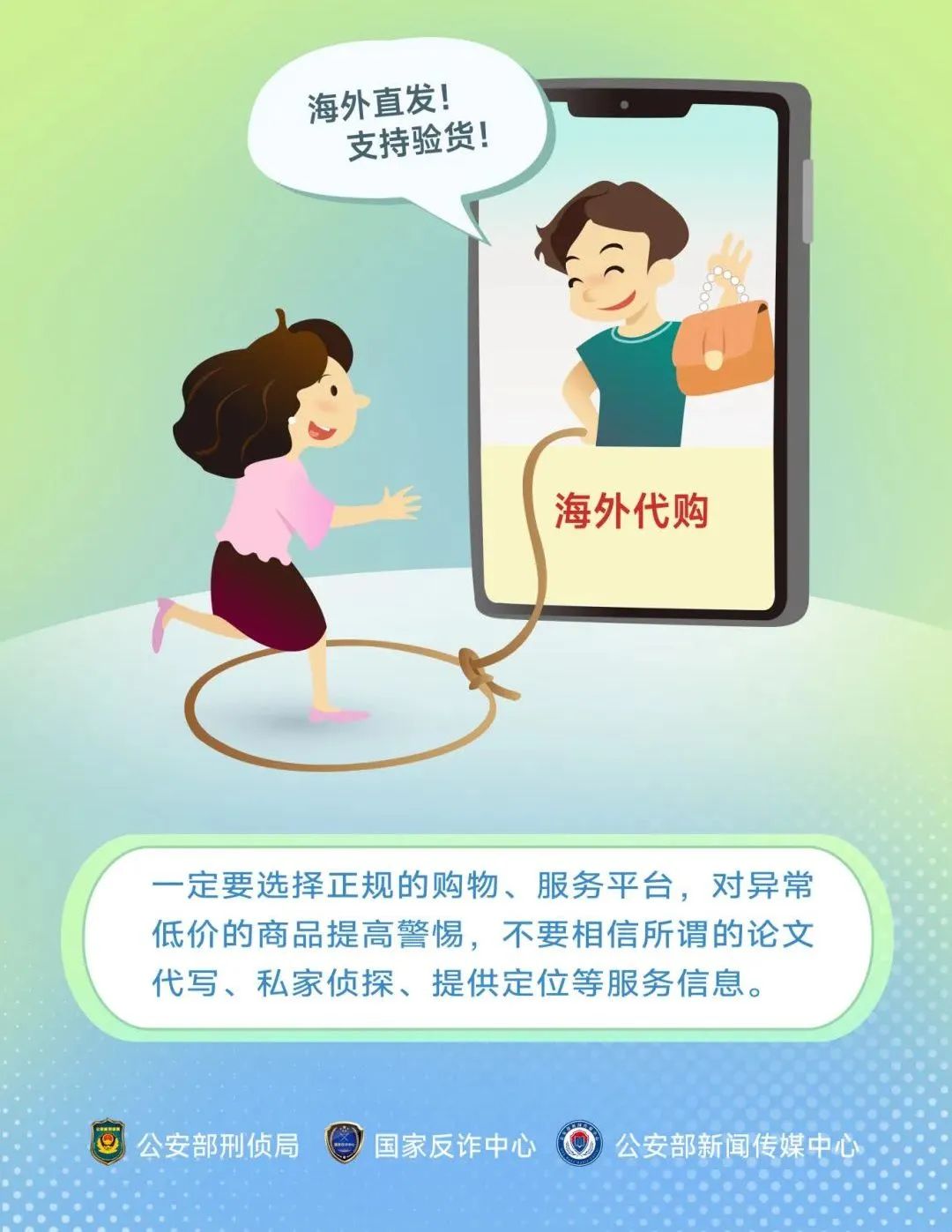 诈骗分子在微信群、朋友圈、网购平台或其他网站发布低价打折、海外代购、0元购物等虚假广告,以及提供代写论文、私家侦探、跟踪定位等特殊服务的广告。