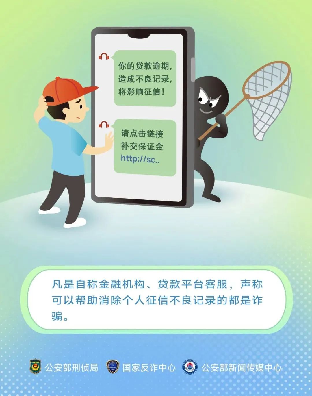 诈骗分子通过冒充银行、金融机构客服人员,谎称受害人之前开通过微信、支付宝、京东等平台的百万保障、金条、白条等服务,或申请校园贷、助学贷等账号未及时注销,或信用卡、花呗、借呗等信用支付类工具存在不良记录,需要注销相关服务、账号或消除相关记录,否则会严重影响个人征信。随后,诈骗分子以消除不良征信记录、验证流水等为由,诱导受害人在网络贷款平台或互联网金融 APP 进行贷款,并转到其指定的账户,从而骗取钱财。